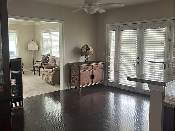 A double-door entry opens to a dramatic foyer with high ceilings and a classic split staircase. The main level features a large living room, formal dining area, a den that can serve as a second living space or home office, a full bedroom and bath, and direct access to the backyard. Upstairs, four additional bedrooms provide room for family, guests, or multigenerational living.