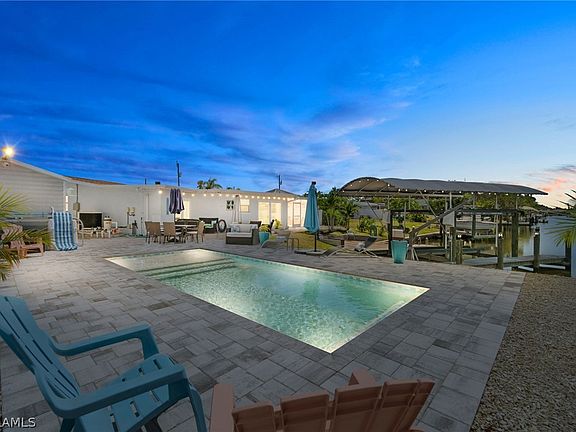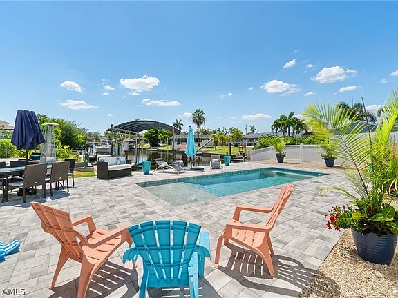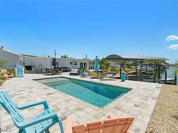 **PERFECT AIRBNB OR VACATION RENTAL!!!*****SELLER MOTIVATED, BRING ALL OFFERS**DON'T LET THE VIEW FROM THE STREET FOOL YOU! THIS HOME IS HUGE**! The home offers TWO **LUXURIOUS MASTER SUITES**, making it ideal for a vacation rental, and is sold fully **TURNKEY**. Welcome to your dream home in the prestigious Yacht Club area of Cape Coral! This **COMPLETELY REMODELED** Gulf access gem features a charming wood captain's walk and a robust 10,000 lb boat lift complete with a canopy, offering you an effortless 10-minute cruise to the river. Situated on an oversized lot, this home provides breathtaking canal views from the brand new **SALTWATER POOL WITH ELECTRIC HEATER**, surrounded by extensive outdoor living spaces. Inside, you'll find elegant plank style tiles throughout, complemented by an abundance of natural light pouring in through the brand new **HURRICANE IMPACT WINDOWS AND SLIDERS**.The tastefully decorated interior features **QUARTZ COUNTERTOPS** and a beach-inspired décor for a warm, inviting ambiance. Additional amenities include a vinyl fence for privacy, a shed for extra storage, and a freshly paver circular driveway. Electrical and plumbing have been recently updated, ensuring modern comforts and peace of mind. Don't miss the opportunity to own this unique, completely remodeled waterfront haven, within walking distance to local bars and restaurants! *FLOOD INSURANCE IS TRANSFERABLE*