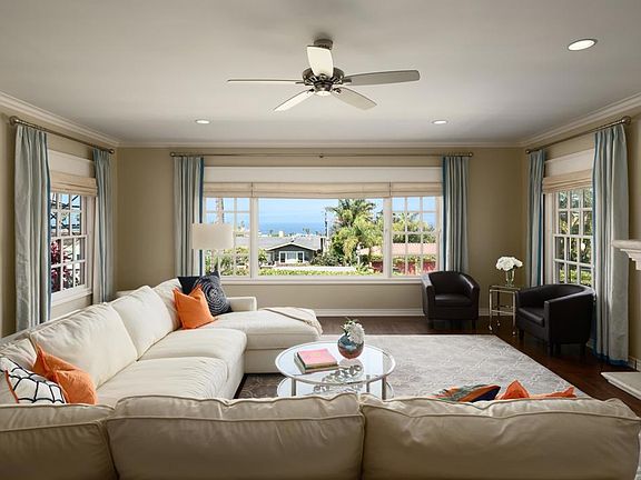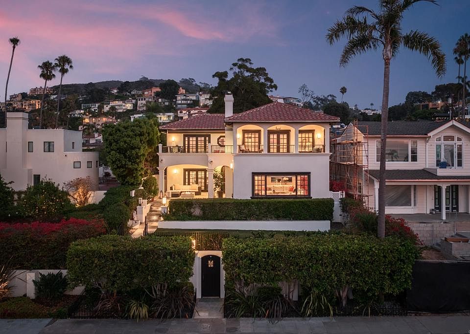 This stunning Monterey Colonial-style home is elevated above the street, offering sweeping panoramic horizon ocean views up the northern coastline. As you step inside, you’ll immediately notice the high ceilings, central staircase, multiple fireplaces, elegant arched doorways, and open floor plan, all complemented by French doors that seamlessly connect the indoors to the outdoors. The tastefully upgraded kitchen, featuring high-end appliances, is paired with an adjacent dining area and family room, creating an ideal space for entertaining. A large living room, framed by expansive windows, showcases breathtaking territorial and ocean vistas. Rich hardwood floors throughout enhance the home’s refined, understated luxury. On the main level, you'll find a thoughtfully designed office/bedroom with custom cabinetry and a fireplace, along with a private bedroom suite, both sharing a private bougainvillea garden view. Pass the laundry room and enter an attached two-car garage with access from Olivet Lane. Upstairs, an additional bedroom and a spacious, luxurious primary suite await. The primary suite features dramatic views with an oversized fireplace and a stylish bathroom with custom walk-in closets. There is no shortage of outdoor space, the primary bedroom offers a private balcony, and a large shared balcony perfect for enjoying the mesmerizing views of La Jolla cove. The sunny backyard is highlighted by a pool and spa, offering a serene space for relaxation, while the front yard boasts covered seating and a turfed play area, all enclosed by privacy gates. The home’s coveted location is within walking distance of the Village and offers easy ingress and egress, making it as convenient as it is desirable. With its upgraded condition, panoramic views, and appealing features, this property is truly one to be seen.