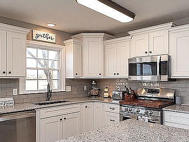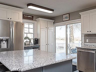 This 1970’s split-level home was recently remodeled and updated in 2018/2019. It has an open floor plan with full finished basement. The kitchen boasts custom cabinetry with granite countertops (also in both bathrooms) and Kenmore Elite stainless steel appliances. Tile flooring in kitchen, dining room, and both bathrooms. Luxury vinyl planking throughout the rest of the home, excluding the three extra bedrooms which still have carpet. Master bedroom has a walk-in closet and walk-in tiled shower in en-suite. Outside the kitchen sliding doors is a composite back deck and partially fenced back yard. Outdoors you will find a 40'x35' concrete floor shop with new metal on roof and walls and a 60x100' building/barn out back with power. Water hydrants are scattered throughout the property for easy access. There are a couple other open sheds and fencing throughout property. One lean-to is already converted into a chicken coop. Beautiful setting on 12 acres with a pond just north of Nevada on blacktop.