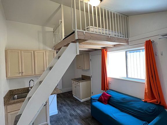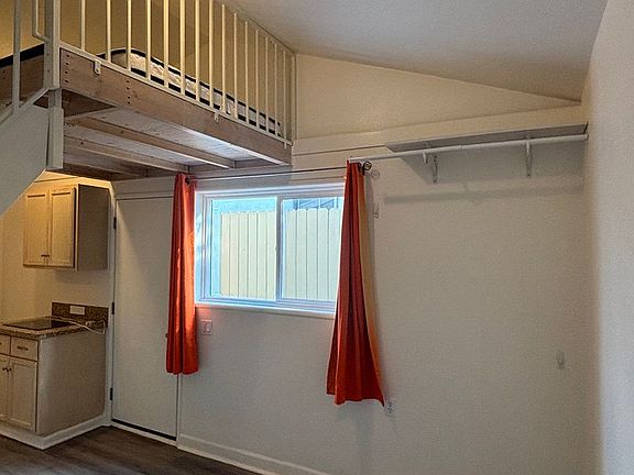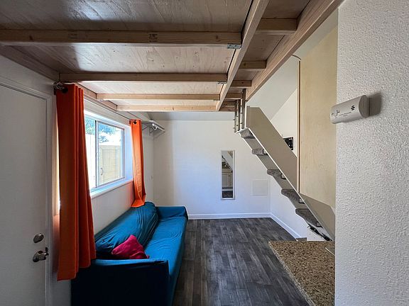 This compact studio maximizes space with a clever layout, featuring a small upper loft perfect for a mattress, while keeping the main floor open for living and dining. The kitchenette is outfitted with cabinets and quartz countertops, and the bathroom includes a deep medicine cabinet to provide additional storage. Accessible through a private gate on the side of the main house, the studio also offers a small side yard for added outdoor privacy. Cozy and low-maintenance, this studio provides a private and functional living space.