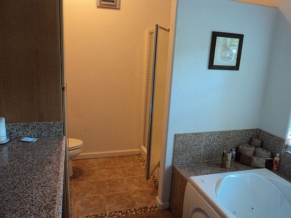 Beautiful newer energy efficient custom built 3 bedroom, 2 bathroom home. Updated kitchen has so much to offer: custom cabinetry, tile floors, kohler sink with solid granite countertops & large pantry. Large master suite with wonderful jetted tub, shower, walk-in shower, custom tile, granite countertops & lots of storage. Ceiling fans throughout the house with a great whole house fan. Nice size spare bedrooms & one has large walk-in closet with spare bath. Spacious 12 x 24 foot redwood deck that overlooks the mature plants & trees, large shed & fully fenced. Newer flooring. Oversized 2 car garage with work bench. Not in the POA.