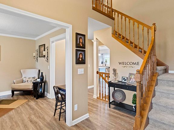 Pride of ownership abounds in this 2-story home on a finished walkout basement, located on a pond lot in the award-winning Leo school district! A 2-story foyer welcomes you in, with a bright office or dining space to the left and the living room to the right. The spacious and bright living space has a gas fireplace and tall windows that open onto the rolling backyard. The kitchen has been recently renovated with 2-tone painted cabinets, quartz countertops, tile backsplash and luxury vinyl plank flooring. A main floor laundry room and half bath are just off the kitchen. Upstairs you will find 4 roomy bedrooms with spacious closets, as well as 2 full bathrooms. The master suite has been freshly refinished with new tile flooring and a free-standing soaking tub and has a separate shower. With 2 spacious walk-in closets, there is plenty of room for storage. Downstairs is a fully finished walk-out basement with open but segmented space for entertaining or hobbies. Outside you will find a freshly repainted upper level deck, and just below is a stamped concrete patio with built in firepit and wood storage, perfect for entertaining and warming up by the fire on a crisp fall night. Invisible fencing is ready for your furry friend. For all your holiday festivities, the home has been fitted with permanent LED lighting that can be customized in a spectrum of colors, at your choosing. Don't wait, this one is a total GEM! MAJOR UPDATES INCLUDE: HVAC/Furnace - 2019, LVP/Carpet - 2022, Humidifier - 2022, Water softener and R/O system - 2021, Basement grinder pump - 2022, Permanent holiday lighting - 2022, New roof and exterior paint - 2023