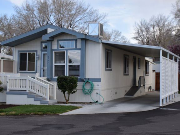This beauty sits on a quiet corner lot with covered parking and a fully fenced back yard. Gorgeous laminate wood flooring throughout the living areas. Upscale kitchen with upgraded countertops and stainless steel appliances. Guest bedroom has french doors leading to a patio with retractable awning. A third bedroom has been modified to be a "sitting room" off the master bedroom and has a full closet. Handicap access. Light, bright and clean!
