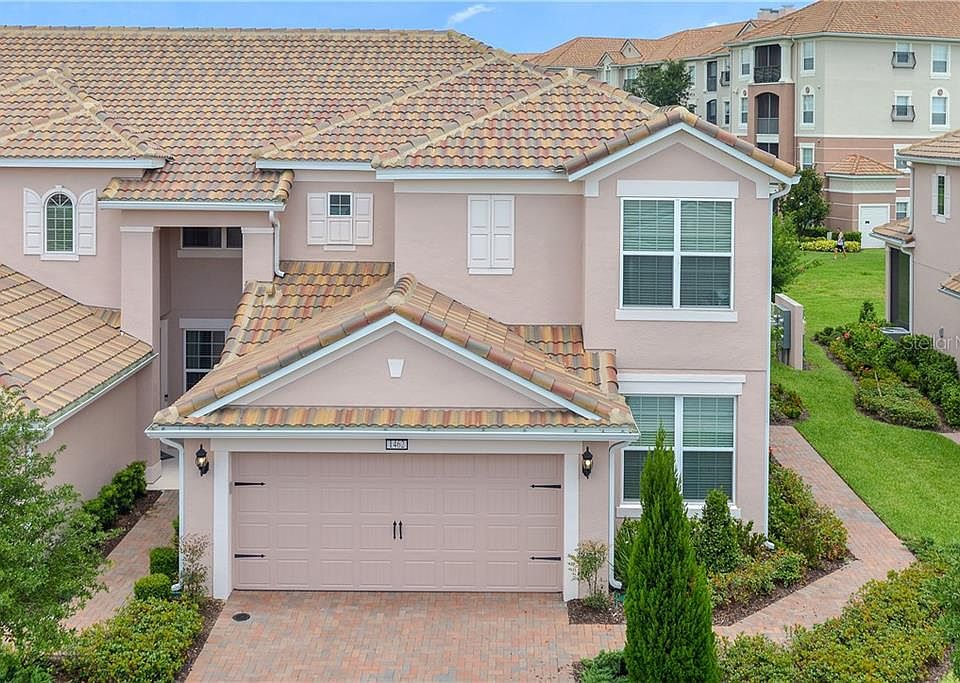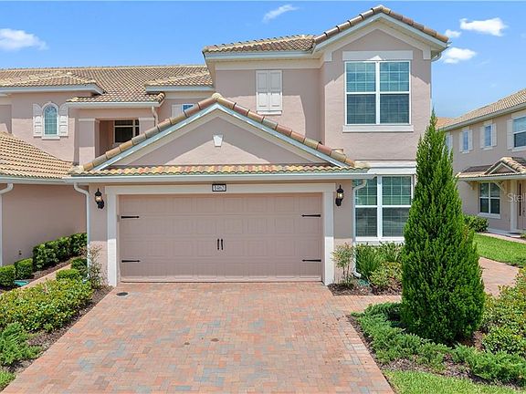 Welcome home to this pristine Mirella floor plan! The largest in the community with almost 2,400 sq ft. This magnificent townhouse in the highly desirable guard gated community of Bella Trae in upscale Champions Gate. The first floor offers an open plan featuring a large kitchen with eat-in space, island, and beautiful granite counter tops. The great room features amazing double story vaulted ceiling. A large master suite, 16' x 13' bedroom, en-suite bathroom with separate shower and soaking tub, dual sink vanity and large walk in closet. Utility room and half bathroom round off the first floor. Upstairs is a large loft area overlooking the living room, 2 further bedrooms and a full bath. Outside is a screed in lanai to enjoy the beautiful water views and 2 car garage. Bella Trae is a guard gated community with a 12,500 square foot private clubhouse featuring a state of the art fitness center, heated pool & hot tub, putting green and much more. The rent includes, grounds maintenance, high definition cable, high speed internet, pest control, and building maintenance. Conveniently located to I 4, restaurants and shopping. This is maintenance free living at its best!