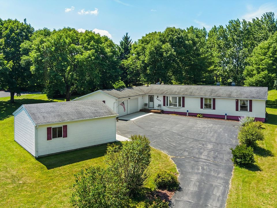 Here is the one you have been waiting for - the 3bedroom ranch, in the country, with 2 garages! This home is perfectly locatedminutes from the interstate and the city. The attached garage has a 3rd spaceoff to the side for a car, boat or tons of toys. The detached garage is onlyapprox. 10 years old. The nicely laid out house features a bathroom off of thegarage entrance, main floor laundry, a living room & family room, spaciouskitchen and dining with patio doors to the backyard. Enjoy the gas fireplaceinside or head outide to roam the 2+ acres. Plenty of updates fill the home.Seller will leave the lawn tractor, lawn tools, patio furniture and more.