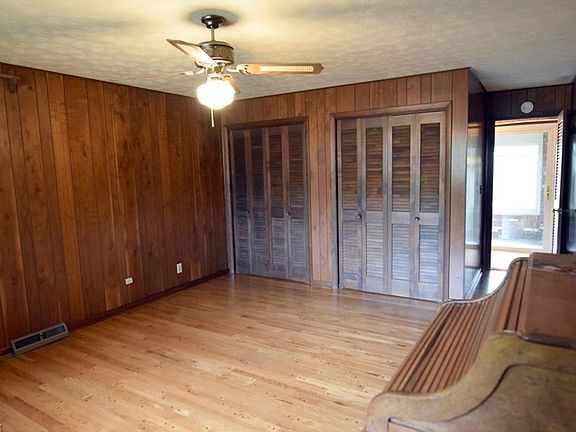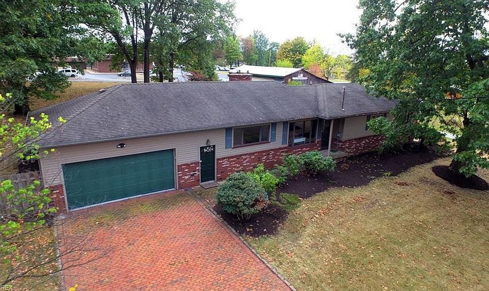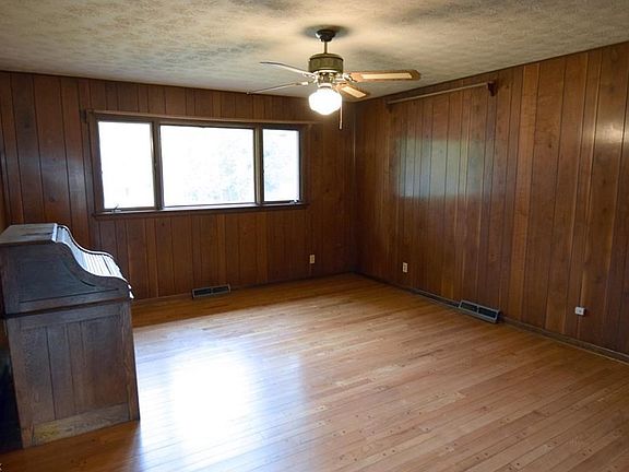 This well appointed ranch home is certain to please, offering all the right attributes to make it your next; or maybe first, home. Intrigue starts outside when you first notice the daring, all brick driveway. Lush landscaping leads around back where a sealed patio area makes for a perfect bath house to the fenced in, inground pool. Across the lot, a huge, rustic garage makes for the perfect shop, mancave, or just additional vehicle storage. Inside the front door, an expansive, carpeted living room opens to a far brick wall with fireplace. Exposed faux truss work plays on the gabled entrance to the kitchen where the beams continue. Here an open floor plan provides maximum space for meal preparation or room for a table. A half bath resides nearby while the hallway continues into the main bedrooms. First passing is a larger, master bedroom echoing the wood paneling throughout the home. A full bathroom locates across the hallway, serving the occupants. Two other rooms boast wood flooring with multiple casement windows and ample closet space. On the opposite end of the home, across from the breezeway, an additional fully wood paneled room serves as a study or an additional bedroom. This room also shows the hardwood style flooring and is outfitted with twin sets of bifold closet doors. Downstairs, a half finished basement offers a rec room and fireplace area, trimmed in a lighter shade of the wood paneling. Laundry, slop sink and additional shower area can also be found nearby.