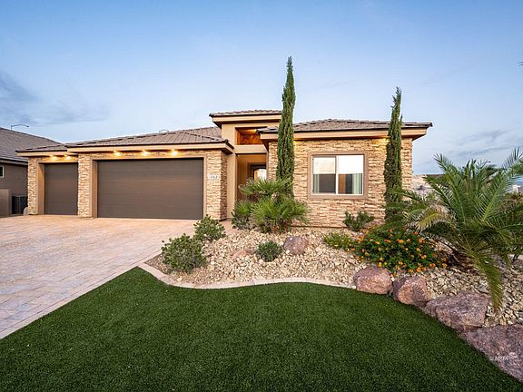 Be sure to spend a moment exploring this beautiful home in the Gated community of Royal Vista! This is an original owner home and it shows like a model! The community is gorgeous and the builder quality is exceptional. You'll find 2x6 Exterior walls, wood crown molding and base board and wood interior doors are just a few of the upgrades found here. A Beautiful paver driveway and gorgeous stone work make this home a stand out! A gorgeous metal entry door with leaded glass welcomes you inside a lovely entry area. Inside the home, 3 bedrooms, 2 bathrooms & an exceptional living area showcase further quality details such as porcelain tile, knotty alder cabinetry, stainless appliances, granite countertops, backlit trey ceilings, pendant lights and more! The backyard is fully fenced to make for a pet friendly yard and sits beside the community common area park that almost feels like an extension of your own yard. The large covered patio has been upgraded with automatic sun screen shades, an extended paver seating area and even a area with synthetic grass. The backyard faces East to provide for cooler afternoons & even provides views of the Virgin Mountains. Dont miss this home!