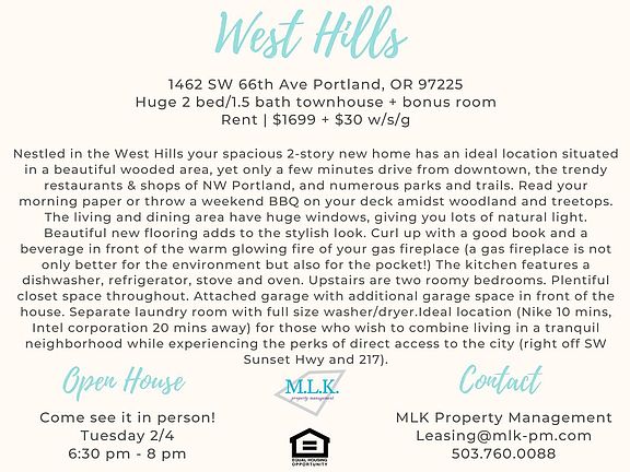 Nestled in the West Hills your spacious 2-story new home has an ideal location situated in a beautiful wooded area, yet only a few minutes drive from downtown, the trendy restaurants & shops of NW Portland, and numerous parks and trails. Read your morning paper or throw a weekend BBQ on your deck amidst woodland and treetops. The living and dining area have huge windows, giving you lots of natural light. Beautiful new flooring adds to the stylish look. Curl up with a good book and a beverage in front of the warm glowing fire of your gas fireplace (a gas fireplace is not only better for the environment but also for the pocket!) The kitchen features a dishwasher, refrigerator, stove and oven. Upstairs are two roomy bedrooms. Plentiful closet space throughout. Attached garage with additional garage space in front of the house. Separate laundry room with full size washer/dryer.Ideal location (Nike 10 mins, Intel corporation 20 mins away) for those who wish to combine living in a tranquil neighborhood while experiencing the perks of direct access to the city (right off SW Sunset Hwy and 217). 1462 SW 66th Ave Portland, OR 97225 Huge 2 bed/1.5 bath townhouse + bonus room Rent ; $1699 + $30 w/s/g
