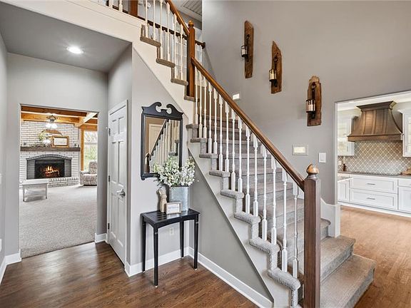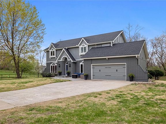 Tucked away at the end of a cul-de-sac on nearly 3 wooded acres, this beautifully updated home offers privacy, space, and functionality—including a heated 34x22 two-story outbuilding! Step inside to soaring ceilings and refinished hardwood floors. The expansive kitchen, remodeled in 2020, features custom cabinetry, a large island perfect for entertaining, two sinks, a double oven, and a vacuum toe kick! Adjacent to the kitchen, a charming breakfast nook opens onto a brand new deck (2024). The deck also connects to a generous living room complete with a gas fireplace and detailed coffered ceilings. The main floor also includes a home office and a library, both with built-in shelving. Upstairs, you’ll find three spacious secondary bedrooms and a full bathroom. The oversized primary suite is a true retreat, offering sunset views, a walk-in closet, and a remodeled ensuite with double vanity, water closet with built-in storage, a large shower, and a convenient new laundry area. The walkout basement includes an open rec room with a gas fireplace, a 5th bedroom with a walk-in closet, and generous storage space. Recent updates include: Roof & downspouts (2025), Gutters (2019), New windows (2020), Front & Back patios (2023), Exterior paint on home and outbuilding (2021) & more! Located just minutes from Creekside in Parkville with easy highway access—and no E-Tax!