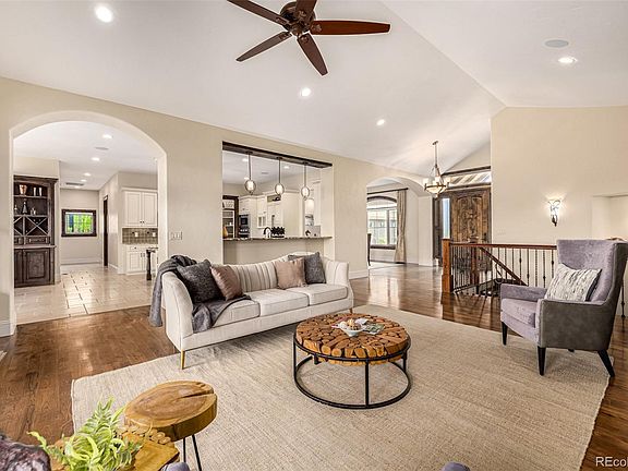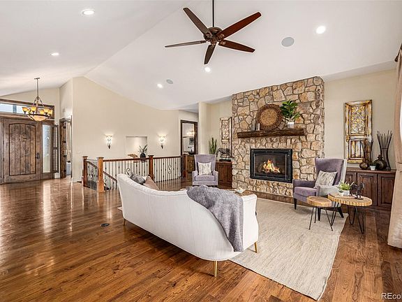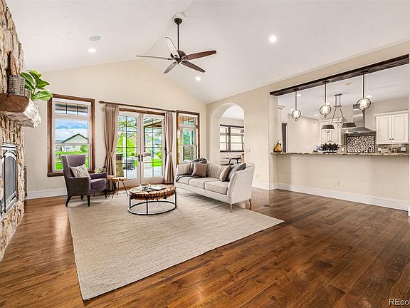 Step into your dream home! Embrace the allure of this ranch-style abode featuring a spacious 5 bedrooms, 6 bathrooms, a 3-car garage & a fully finished basement, now on the market! Adorned with stone accents, it sits amidst a verdant landscape, inviting you in through a charming front porch. Captivating interior highlights a bright living room boasting a stone gas fireplace & vaulted ceilings. Surround sound speakers, French Doors, ceiling fans, & recessed lighting throughout! The gourmet kitchen offers custom cabinets, Thermador appliances including gas burners & a built-in refrigerator, a walk-in pantry, gorgeous granite counters, a copper farm sink, a pass-through window w/breakfast bar, & a center island w/prep sink. The luxurious main retreat showcases a sitting room, a fireplace, private back access, a walk-in closet, & a spa-like ensuite. Oversized steam shower, soaking tub, & L-shaped vanity w/dual sinks & makeup area complete the main bathroom! Sizable bedrooms with walk-in closets, lavish bathrooms, & delightful den for an office. Each room is a work of art! The finished basement has over 11-foot ceilings and includes a theatre room, entertaining area, game area, dining area, and an amazing must-see bar! There's still more! Large laundry room featuring a mudroom, L-shaped counter, & utility sink. Unwind in the tranquility of relaxing afternoons or host lively BBQs in the sprawling backyard, complete with a covered patio, open-air space, water feature, fire pit, a meticulously maintained lawn, and mountain views. With its lavish amenities and picturesque setting, this home epitomizes luxury living. Experience the grandeur that awaits in every corner of this remarkable residence!