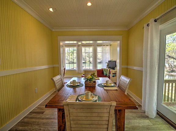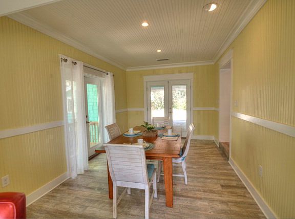Totally renovated coastal river front cottage. Very secluded. Wood burning FP has gas line, Tile throughout with sheet rock and bead board ceilings and walls. Concrete block house with hardi shake siding and metal roof. Foam insulation - home is TIGHT. Sun dock on river with small creek on east side for launching kayaks - bulkhead. Green insulation in interior walls. Gourmet kitchen with pot filler over gas stove top, convection oven. Barn wood tile flooring throughout. Paradise found....
