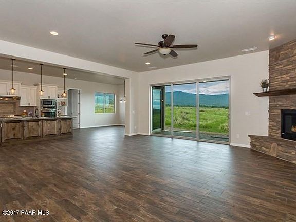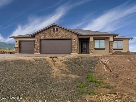 Luxury ranch living in the newly developed, premier neighborhood of Legend Hills. Gorgeous city light views of Prescott and Prescott Valley, panoramic views of Mingus mountains on a 2-acre, corner lot with paved roads. This beautiful custom home offers 2,705 sq. ft. single level with 4 beds, 4 baths including 2 master suites and a guest suite. Large eat-in kitchen with island, quartz stone counters thru-out, wood-look, planked tile flooring thru-out, knotty alder cabinets with self-closing drawers and doors, covered paver patios front & back, paver driveway, stone fireplace with hearth and custom knotty alder mantle, large master shower with garden tub and vanity seat, lots of storage space, walk-in closets, and huge 3-car garage with service door. Just minutes to Glassford Hill shopping.