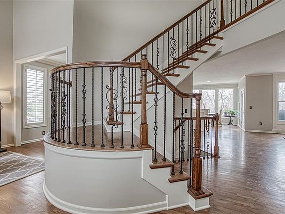 Spectacular Home on one of THE BEST LOTS in Shawnee! Prime, back-of-the-culdesac location with 1/2 an acre, a HUGE backyard, plus a NEWER fence (2021). You'll love the exceptional privacy, the treed view, and the summer shade as you enjoy the afternoon from your upper and lower deck (backs east!). Impressive 2-story entry with curved staircase, plantation shutters at the front windows, and beautiful HARDWOOD flooring throughout the main level for a luxurious look and easy maintenance. The kitchen is stunning with stainless appliances, beverage center, endless countertops & cabinetry for all your storage needs. Oversized island allows for casual seating, plus a breakfast room for everyday meals and easy views of the trees. There is also a spacious great room with fireplace, a formal dining room, and a den (perfect for a grand piano, a sitting area, or even a work-from-home zone). The curved staircase features iron spindles, and upgraded wood flooring that continues through the hallway upstairs and into the master bedroom suite. The master bath has soothing spa-like updates, frameless shower enclosure with seat, and double vanities with extra storage. Convenient bedroom-level laundry room & linen closet. Generous guest bedrooms with direct bath access and walk-in closets. Upstairs carpet and basement carpet is BRAND NEW (March 2023). Finished WALKOUT lower level with bright & open family room, full bath, and bonus room with window/natural light (perfect for 5th/guest bedroom, exercise room, or home office). Plenty of room to roam in the backyard , plus a sprinkler system for a lush lawn. Don't miss the additional treed yard space that is behind the back fence (see aerial map) ... perfect for a firepit/seating area , s'mores, & more.