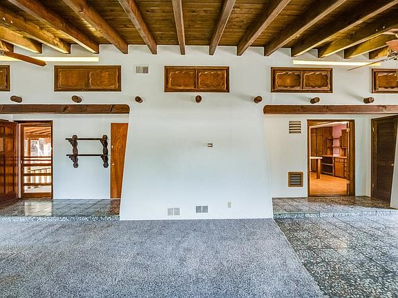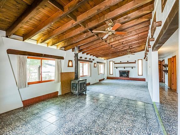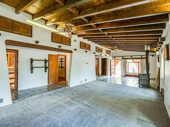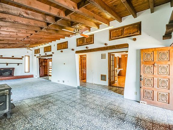 A Fabulous single story home with rustic charm in a West Area neighborhood. This home is bursting with unique architectural touches throughout. A spacious Living Room with a plethora of windows framed by bumped out angled walls with built in Lighting and vigas and beams drawing your eye up to the wood beamed vaulted ceiling. A Fireplace with wood mantle and brick hearth and a wood stove creates a cozy atmosphere for this large space. Step up into the large Kitchen with real wood cabinets, hardwood floors, a pantry and center bar seating island. A long hallway with built-in storage that homes a guest bath with a walk-in shower and two bedrooms, one with wood floors that is connected with a Jack and Jill half bath. Also in the hall is a full bath with a fairytale cottage vibe. With Wood beamed ceilings and sky light natural light floods the space highlighting the wood mouldings and large paned window, Single sink wood vanity and tile enclosed shower/tub. A family/Bonus Room with wood floors, centered by a fireplace that's flanked by windows, and has access to the carport. Just off that space is another bedroom with a paned window wall making it a perfect space for an office. You have three access points to get to the large fenced in backyard with a covered porch and spacious patio. Mature trees and retaining wall with grass is a welcoming space for those hot summer days. Lovely curb appeal with two driveways, grass lawn and a mature tree in the center. Book your viewing today!