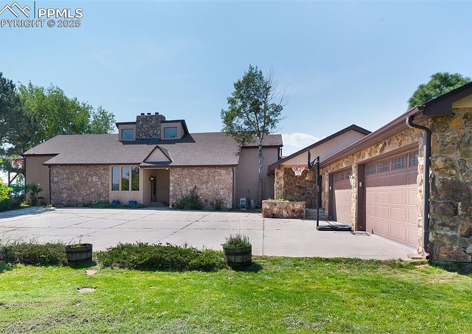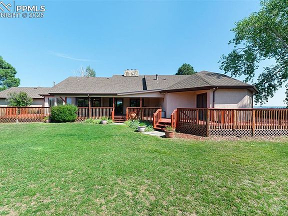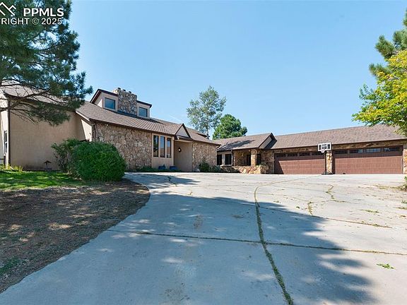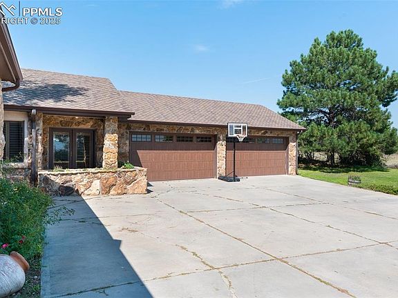 This extraordinary 10.2 acre horse property offers a combination of panoramic beauty, luxurious living & equestrian functionality. The elegant 6,322 sq. ft. ranch style home features 7 spacious bedrooms, 5 bathrooms and an oversized attached 4-car garage. On clear days you'll enjoy 365° views stretching from Castle Rock to Pikes Peak. Resort-style amenities abound, including a stunning swimming pool with 3 cascading waterfalls & a whimsical "Flintstone" diving board made of natural rock, a gas firepit & a hardwood deck that is mostly covered. The deck wraps the back & eastern side accessible from the primary bedroom, living room, kitchen, sunroom & wet bar offering year-round enjoyment & peaceful views. The fully fenced and cross-fenced land includes two corrals, an 8 stall barn complete with tack room, a hay drop, plus a work shop & detached two-car garage ideal for storing ATVs or equipment. This is the perfect property for enjoying a sunset ride on your horse. Inside, the home immediately impresses you with a vaulted 20 x 30 living room & a dramatic 20-foot stone wood-burning fireplace, skylights, Italian tile & natural wood flooring. A unique second-story loft featuring a wet bar extends to overlook the living room, adding charm and entertainment appeal. The beautifully appointed kitchen features granite countertops, custom cabinets, gas cooktop & marble tile flooring. All stainless steel appliances & washer/dryer are included. Just off the entry is a spacious pool room w/double doors to the outside & offers flexibility as a formal dining space or entertainment hub. The main-level primary suite includes French doors to the deck, a luxurious jetted bath & a cedar closet. In addition, there is a generous 24' x 28' family room w/vaulted ceiling which provides ample space for media, games, or gatherings. It's a true Colorado gem designed for comfort, recreation & adventure! This home delivers an unmatched lifestyle for horse lovers & luxury seekers alike.