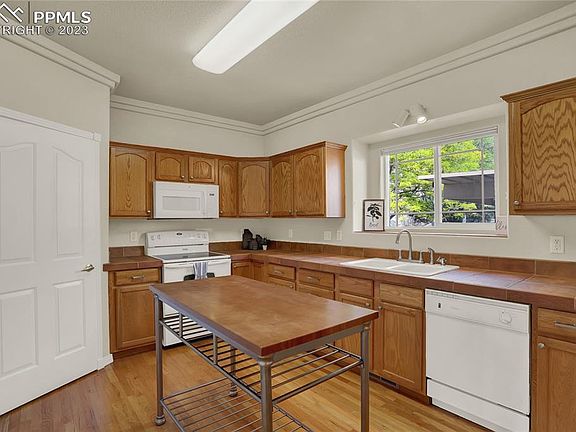 4 bed, 3 bath condo on the west side! Main level living and a walkout basement! Well maintained with a wide entryway to welcome you home! The master suite is on the main level and has a bay window with views of Cheyenne Mountain, an adjoining full master bath with jacuzzi tub, a very spacious master closet, and direct access to the back deck (TREX). The main level kitchen has hardwood flooring, a full compliment of appliances, a large walk-in pantry, tile counters, and oak cabinets. The living room has a built-in entertainment center, gas fireplace, and access to the back deck. The walkout basement has French doors leading outside, three more bedrooms, a full bath, and a large family room! The house comes with central AC, top down/ bottom up shades, a utility sink, recessed can lighting, ceiling fans, coffered ceilings, and more! Great location, nestled into the hillside, two blocks to grocery shopping and restaurants, less than 10-minutes to Red Rocks Open Space, 15-minute walk to Old Colorado City, and 10 minutes to the heart of downtown Colorado Springs!