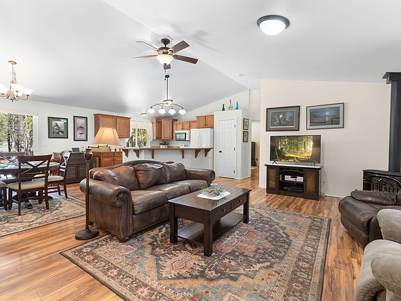 Enjoy SERENITY and PRIVACY in this beautiful single-level home located on a spacious 1.67-acre cul-de-sac lot in the desirable Ponderosa Pines community, a Firewise-certified neighborhood. Backing to national forest land, this peaceful retreat offers the best of both worlds—secluded nature and town amenities just minutes away. The home features a great room floor plan with vaulted ceilings and an inviting kitchen, ideal for both daily living and entertaining. Kitchen comes equipped with ample storage, bar seating, and a spacious pantry. The living area is centered around a cozy propane fireplace, perfect for cool mountain evenings. You'll love the spacious primary bedroom with a walk-in closet, dual vanities and walk-in shower. Additional features include an ADA-friendly entry ramp, graveled circular driveway, backyard fencing, storage shed, RV parking, and an OVERSIZED 2-car garage for ample storage. Close to all that Central Oregon has to offer.