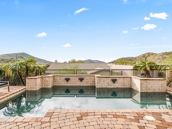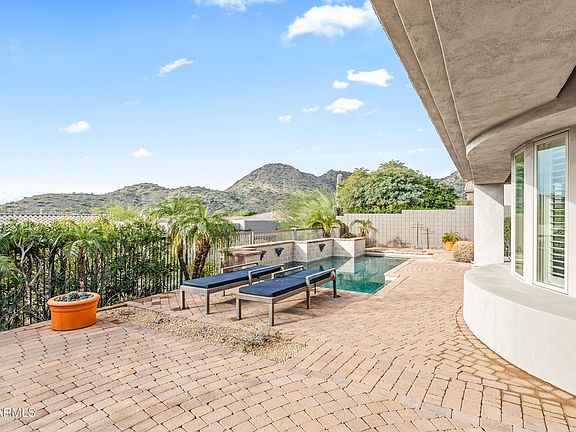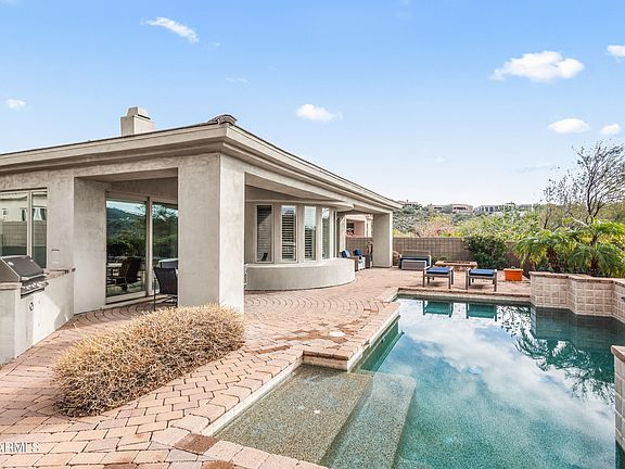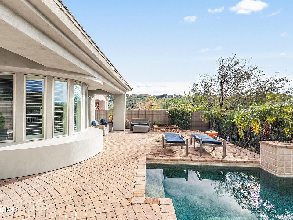 Tucked quietly against natural desert surroundings and behind a gated community on a cul-de-sac, this exceptional home sits on a premium lot with breathtaking mountain views. Originally selected by the owner for its ultimate privacy, the home backs to a common wash and pristine natural desert with endless views looking out. Designed with a bright, open, customized floor plan, this home is an entertainer's paradise. The serene backyard features a custom Pebble Tec pool with a tiled backdrop and three water spouts, surrounded by expansive paver patios with built-in planters. Additional outdoor highlights include paver counters, firepit, two covered patios with ceiling fans and lighting, flowering bushes, and Palo Verde trees—your own private desert oasis. Inside, enjoy custom paint in a neutral hue and 21" sandstone tile floors throughout the main living areas. The gourmet kitchen showcases custom cabinetry, a butcher's block kitchen island, a ceiling mounted pot rack, granite block countertops, an electric range (with gas line available for future conversion) and plant and picture shelves. The breakfast area features a bayed wall of windows with stunning mountain views. The gracious, banquet-sized formal dining room is highlighted by oversized Arcadia doors framing the scenery beyond. The tiled living room offers art niches, clerestory windows, a warm stone gas fireplace, and a built-in TV/entertainment niche. The spacious primary suite features free-form 21" tile and plush carpet, with sweeping views through oversized Arcadia doors and side windows. The romantic spa-style bath includes a Jacuzzi Roman tub, an updated shower, dual vanities, a vanity table, glass block accents, chrome and brass fixtures, tiled floors, and a spacious walk-in closet. The second bedroom offers double-door entry and a private en suite bath. The third bedroom is privately located in a seperate wing and conviently located adjacent to the third full bath. Additional features include custom sheers throughout, ceiling fans, designer light fixtures, security system, soft water and reverse osmosis systems, a large laundry room with utility sink and added cabinetry, and a side-entry garage with a curved driveway. Ideally located just minutes from sought-after resort golf communities and highly ranked BASIS charter schools, recognized at both the state and national level for academic achievement. Discover this exceptional home nestled in the McDowell Mountain foothills, featuring stunning views, a private desert setting, convenient access to amenities, and proximity to top-ranked BASIS charter schools.