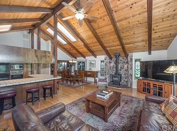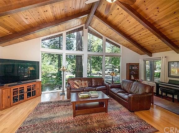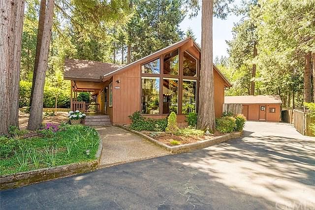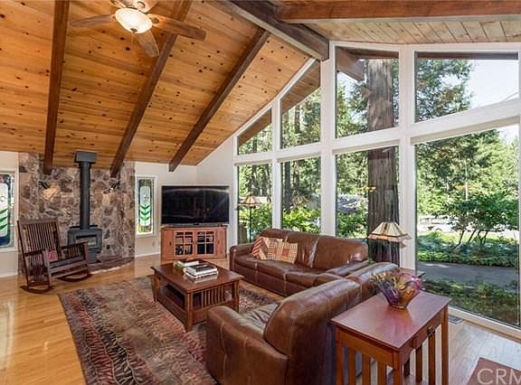 Your Mountain Retreat! Stunning two bedroom two bath home with soaring glass windows for amazing natural light. Enter from the covered porch through the hardwood door (with cut glass accents) to the huge main living area. Large cozy wood-stove flanked by gorgeous stained glass windows. Beautiful hardwood floors, convenient kitchen open to all areas with pass through and breakfast bar. Bring your morning coffee and step out the master slider to your private garden area, where flowering shrubs and peaceful serenity await. Large master suite with huge walk in closet, custom stained glass windows. Master bath has double vanity, large walk in shower, includes a huge jetted tub, which also looks out to the glorious garden. Just a few of the interior amenities: gas range top, whole house vacuum, skylight that opens, newer dual pane windows throughout. Laundry room with extra storage, which leads out to the back covered patio. High efficiency instant hot water, heat and air system only 7 years old. Many surprises and extras. Automatic gated entrance to the back, plenty of parking, two car garage with additional bonus room, RV carport and propane tank is owned not leased. Wait until you see the gardens! Don't miss this lovely home.