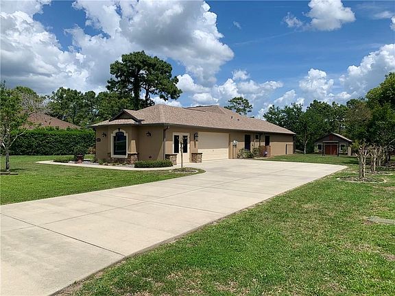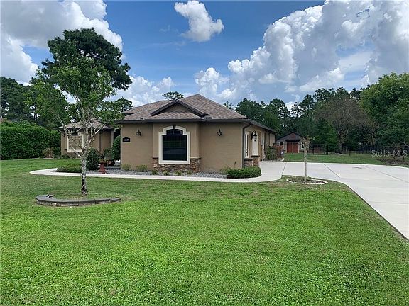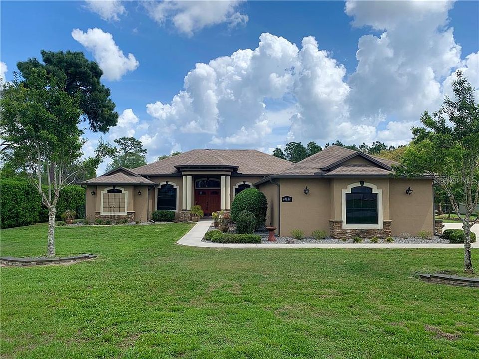 Custom home on .50 acre in Springwood Estates!! This gorgeous and immaculate home is move in ready and offers 2471 sqft, 3 bedrooms, 2 baths, 2 car garage, FENCED YARD, separate 200sqft BONUS ROOM OR OFFICE with its own outside entrance, formal living and dining room, family room, 256sqft (16x16) WORKSHOP with deck, spacious 260 sqft screened lanai and a 11x40 paver patio. Stunning curb appeal and a welcoming entry greet you as you step inside this model like home. If you are looking for space and room inside and out this is it. The large ½ acre lot offers mature landscaping, trees and no back neighbors. The eat in kitchen has a large breakfast bar, granite counters, tile backsplash, built in shelves and ledges for decorating and a new induction range. The family room is tucked nicely off the kitchen and has an electric decorative fireplace. The master suite is accented with a tray ceiling and offers access to the lanai through the set of French doors. The master bath goes above expectation with the double entry to the walk in shower, tiled walls, garden tub, dual sink granite vanity and a large walk in closet. There is additional access to the lanai through the sliders in the kitchen and formal living room. There is a separate 200 sqft vented bonus room off the garage with an exterior French door entry and an inside entry that would be perfect for a home office, fitness or hobby room. Parking for up to 8 cars in the driveway that leads to the side entry garage. The detached 256 sqft workshop has electric, side 8x14 deck and a double door entry. Additional features include: new black coated chain link fence Dec 2020, tinted double pane windows, irrigation system, gutters and a laundry room with a deep sink, cabinets and folding station. Bonus room is off of the garage and can be entered without going through the home which makes it perfect for a work at home situation (can also be entered through the garage). Great location close to the Suncoast Parkway, shopping and restaurants. Sought after community with NO HOA and homes on large lots. Some furniture available and negotiable.