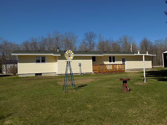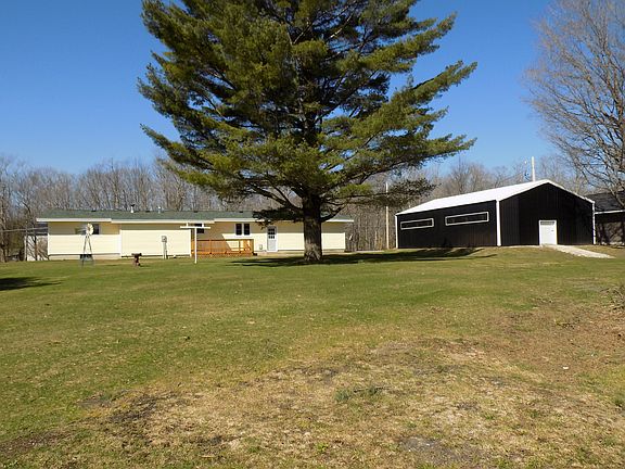 Great location best describes this 3 bedroom, 1.75 bath, ranch style home with attached, 2 car garage on 6 acres. Full, partially finished basement, 30' x 48' pole barn with 10' high ceilings and cement floor. Landscaped yard with huge garden spot. Recent updates include, newer roof, vinyl siding, windows, kitchen, baths, hot water heater, holding tank, deck and wood furnace with duct work. Well maintained home with trails through the woods, apple trees all located on a quiet country road close to town. Immediate Occupancy.