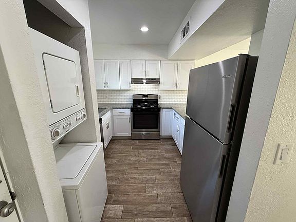Beautifully remodeled 2BR/1BA end-unit in central Tucson! This home features stylish wood-look ceramic tile throughout, a modern kitchen with stainless steel appliances, granite countertops, and updated cabinetry. The bathroom has been fully renovated with quality finishes. Enjoy the convenience of an in-unit washer/dryer and a private fenced yard, perfect for outdoor living. Located close to the UofA, shopping, and dining, with easy access to major roads. Pet-friendly and move-in ready schedule your viewing today! 12 months.