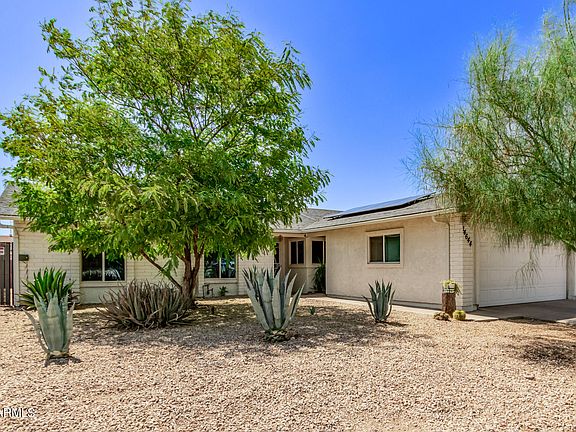 As you arrive, you'll be greeted by an attractive desert landscape, a 2-car garage, and an RV gate. Step inside to a spacious living room adorned with vaulted ceilings, a soothing palette, and durable tile flooring that promises both style and longevity (Click More... to see the rest of the description). The eat-in kitchen is a culinary delight, featuring elegant granite counters, wood shaker cabinetry, a mosaic tile backsplash, stainless steel appliances, and a convenient pantry for ample storage.
