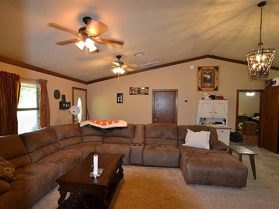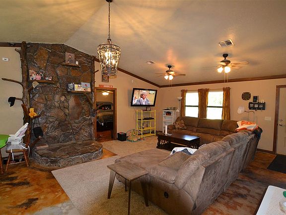 Desirable, 1931 sq ft 4 bedroom, 2 bath home on 5 acres with lots of mature trees. Perks include inviting front porch, large mud room, movable island with storage and nice cabinetry with unique handles. Property offers storm cellar, 2 wells & 2 shops. One is 30x40 steel frame with concrete floor, electricity & 2 overhead doors. The other is 20x20 steel frame with concrete floors. Property has RV hook-up and septic tank for RV. Propane gas range & heat for energy savings. Propane tank stays with home. Home is wired for security & seller is leaving cameras. Seller to install new flooring in the living, kitchen, 1 bath and 1 bedroom.