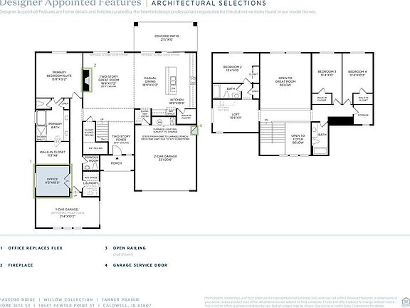 The Tanner is the perfect home for families who enjoy living in style and grace. Guests will step into a grand two-story foyer that opens to an impressive great room, which features a two-story ceiling and plenty of natural light. Just off the great room rests an impeccably appointed gourmet kitchen with ample counter space, center island with breakfast bar seating, walk-in pantry, and adjacent casual dining area. A secluded main floor primary bedroom suite boasts a large walk-in closet and spa-like primary bath with dual vanities, separate soaking tub, and a tile surround shower with semi-frameless enclosure. Additional features include spacious upstairs secondary bedrooms. Complementing the upstairs loft offers possibilities for family game night. Other highlights include versatile flex room. Disclaimer: Photos are images only and should not be relied upon to confirm applicable features.