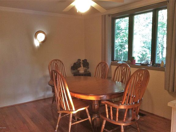 40 Beautifully Hard wood acres with a Pond and a neat Hunting shack in the hillside over looking that pond! Home for the outdoors persons.....2 bedrooms up with full bath. kitchen/dining combo with Maple hardwood newer flooring. Walk-out Basement with woodstove furnace that heats home. Wood furnace has thermostat and vents. Large family room area downstairs and a third possible bedroom ...has a good window may need to put in a little bit bigger window for egress to use as bedroom. Laundry and 2 storage rooms in basement.