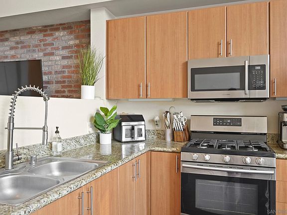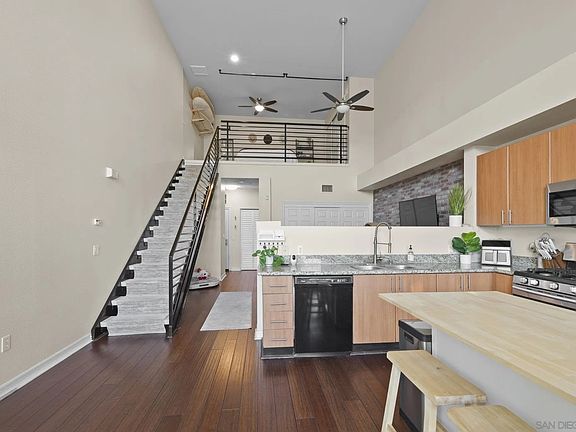 Live the Loft Life! A Rare Find in Union Square! Top-floor condo featuring a two-story loft design with soaring ceilings. Floor-to-ceiling picture windows flood the home with natural light, complete with upgraded motorized shades, both light-filtering and blackout. Open-concept floor plan with a contemporary brick accent wall, engineered hardwood floors, and a spacious kitchen with granite countertops, stainless steel refrigerator, and gas range. Step outside to your balcony and take in the skyline views - perfect for morning coffee or evening relaxation. Newer washer and dryer. One assigned parking spot. Cage storage in the garage. Union Square is a well-managed HOA that offers resort-style amenities: a gym, hot tub, sauna, community room, and electric car charging - ideally located in East Village—adjacent to City College, near restaurants, and Petco Park - easy freeway access (5, 94, 163). With major redevelopment underway in East Village, now is the time to buy. VA approved and ready for its next owner. Turnkey, ready to move in. Live the loft life today!