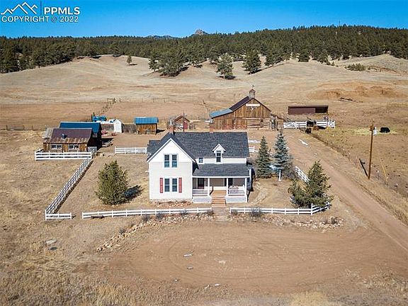 Twin Creek Ranch Est. in 1872, is listed on the National Historical Registry and is still today, a working 62 acre Ranch with cattle, horses and an assortment of farm animals! The beautiful Farmhouse, has been recently remodeled while retaining its original charm and character with authentic door and cabinet hardware, leaded glass, wood flooring, crown molding and a welcoming front porch. The Modern Country eat-in kitchen presents granite counters, lots of cabinet space and upgraded appliances, including a gas stove. Elsewhere on the main level, you will love reading an old western novel in the spacious home study with traditional built-ins, a cozy fireplace and a bay window with spectacular views of Pikes Peak and your never ending green pastures. Youll love entertaining in the formal dining room that looks equally as good with a big fancy mahogany table as it does with a farm table. Then, after supper, feel free to retire to the sitting room where you are again surrounded with views and sunsets. As you ascend the original wood stairwell, you will find 3 bedrooms and a full bath. The master and secondary bedroom are spacious with stunning views. And, soak in your very own clawfoot bathtub while you dream about days gone by. In total, there are 9 structures. The Farmhouse, a Bunkhouse, barn, storage sheds, and a cabin. The Bunkhouse is a four-season cabin that is currently being used as a successful vacation rental year round. The Trappers Cabin has been on the property since the 1840s with ties to the frontiersman, Kit Carson and includes treasures found on the property over the years. This is a True Colorado Mountain Ranch. It makes a great family home, vacation rental, working ranch or even a summer home. No matter what you decide, you will love sitting back, enjoying the scent of freshly cut hay, watching the horses dance in the fields and taking in the breathtaking views of Pikes Peak. Great opportunity to run a multi property vacation rental.
