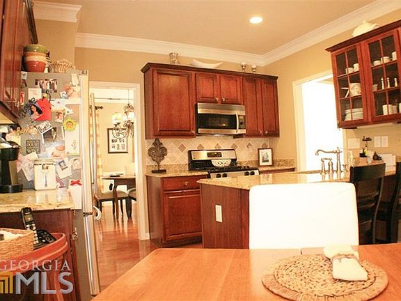 Rocking chair porch. You'll cherish the porch that comes w/this stone home in Peachtree Ct. You'll enjoy 4BRs, 3BA, master ste w/walk-in closet for lots of clothes, linen closet, dual sinks, custom storage, vanity, separate shower, whirlpool tub, captivating dining room, impressive living rm w/wood floors, wet bar, fireplace, modern kit w/walk-in pantry, custom cabs, bookshelves, microwave, gas range, bkfst area, bkfst bar for serving buffets, gr anite countertops.