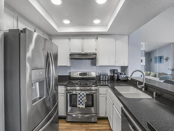 TOWNHOUSE END-UNIT, SOUTH-FACING, OVERLOOKING GREENBELT AND POOL!” WHAT WE LOVE: *Attached one-car garage *Second story living area also grants the space vaulted ceilings in LR and BR *Laundry in unit! *Wood laminate flooring *Open style floorplan with breakfast bar opening up to dining and living room areas *Gas range *Second floor, west-facing balcony *Fireplace *Primary bedroom features bathroom en suite and walk-in closet *Nest smart thermostat