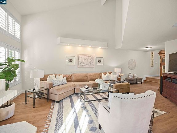 Beautifully updated NE facing duet in desirable Danbury Park with no direct rear neighbors! With vaulted ceilings, this home is open and spacious with an abundance of natural light. Hardwood-style floors and plantation shutters throughout provide added elegance. The eat-in kitchen features white cabinets, granite countertops, recessed lighting and walk-out to the private back patio. The spacious primary suite has an updated bathroom with dual vanity, skylight & large walk-in closet. The secondary bedrooms share a convenient balcony patio to enjoy. Other conveniences include an interior laundry area, no direct rear neighbors & 2-car garage. Located steps away from Orloff Park, an 8-acre green space with kids' play areas, basketball courts, picnic tables, walking trails & lots of open space to run and play. Close proximity to top schools, the shops and restaurants of quaint downtown Pleasanton, 580/680 hwys & Bart transportation. Completely turn-key with low HOA fees! Open Sunday 1-4pm