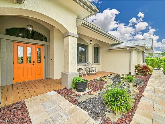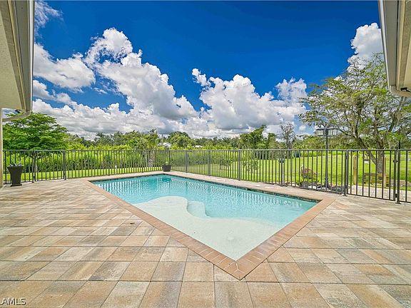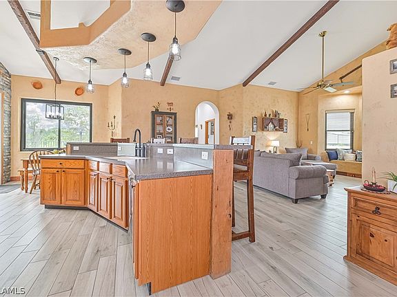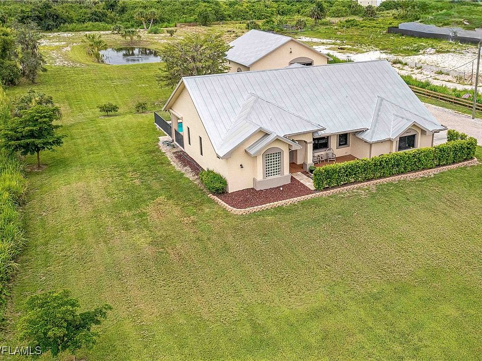 DISCOVER YOUR DREAM OASIS! - NO DAMAGE FROM STORMS - Prepare to be captivated by this extraordinary ranch-style home, nestled on nearly 2.5 acres of meticulously landscaped grounds. With over 2,300 sq ft of elegant living space, this one-of-a-kind property features 4 spacious bedrooms and 2 luxurious bathrooms, adorned with stunning luxury tile wood plank flooring and exquisite custom venetian plaster that reflects sophistication and artistry. Step inside to find an open floor plan accentuated by soaring vaulted ceilings, creating an airy ambiance perfect for both relaxation and entertainment. The gourmet kitchen is a chef's delight, featuring a generous island with a sit-up countertop, ideal for casual meals or lively gatherings. Whether hosting a formal dinner in the dining room or enjoying a cozy breakfast in the eat-in kitchen, this home offers versatility for every occasion. Relax in the inviting living room or transition seamlessly to the expansive lanai that overlooks a sparkling inground pool, lush landscaping, and a serene private pond with a charming fountain—perfect for tranquil evenings under the stars. The outdoor space is an entertainer's dream, complete with a dedicated bar area under a stylish pergola, ideal for summer soirées with friends and family. The property also boasts a large, detached garage with an expandable loft, accommodating up to 4 vehicles and featuring a coveted man cave for unforgettable gatherings. This could be used as an office or craft room as well. This CERTIFIED PRE-OWNED HOME comes with an inspection report, certified repairs, a home warranty, and a buyback guarantee on eligible purchases, ensuring peace of mind for its new owner. Located in the picturesque Olga area of Fort Myers, you'll enjoy a tranquil rural setting while still being conveniently close to shopping on Palm Beach Blvd and just a short drive to RSW Airport. Don’t miss out on the chance to claim this exceptional property as your own private paradise. Schedule your showing today and immerse yourself in the perfect blend of luxury, comfort, and natural beauty!
