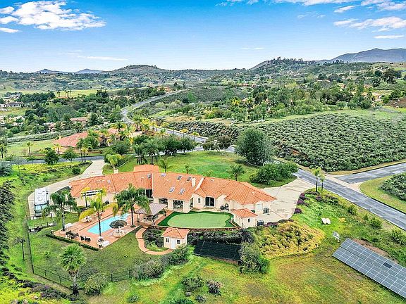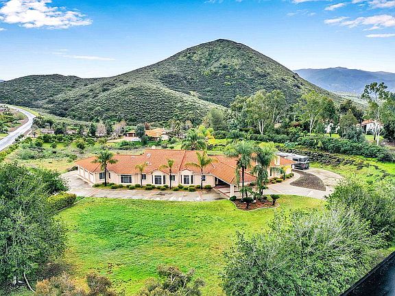 Welcome to the prestigious guard gated equestrian community of Rancho Jamul Estates! This one of a kind custom built single story residence spans over an expansive 2.6 acre lot with stunning panoramic mountainous views. The beauty of this 5,256 sqft estate unfolds as you drive up the circular driveway, passing numerous specimen trees along the way. The driveway opens up to an enormous motor court and beautiful front entry. Natural light overwhelms the interior and a mountain vista serves as the backdrop. This massive 4 bed, 4.5 bath home features a 66 panel solar system (Fully paid), whole house water filtration system, dramatic 18 foot ceilings, 14 skylights throughout, an oversized 3 car garage, 3 RV hookups, dual pane Milgard windows, marble floors, high end fixtures, 2 heating unit furnaces, 2 X 50 gallons water heaters and a private well. The chefs kitchen showcases custom cabinets, marble floors, granite counters, a Subzero fridge, 2 garbage disposals, built-in Jen Air indoor BBQ with 6 burners stove, 2 separate ovens and a warming drawer. Relax and unwind in the stunning luxurious resort style outdoor retreat with a private heated pool and spa, covered pavilion with built in BBQ, 6 hole putting green and mature landscaping - all highlighting the elements of entertainment and relaxation.