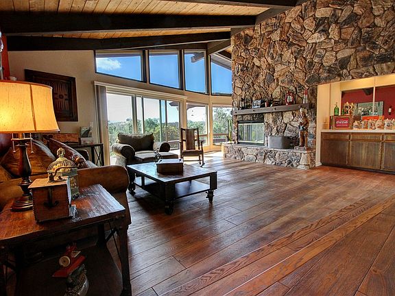 Private get-away on top of your own mtn! This single level home is truly a MUST SEE! Great features include wide plank European Oak flooring, exposed wood beamed ceilings, dual side rock fp, floor to ceiling windows with UV protection & OWNED solar electric. Minutes from shopping, restaurants & freeways and walking distance to Oak Grove Middle School. Plenty of room for cars & toys with a flat lot down below, attached garage and a large circular driveway. Please see supplemental remarks.