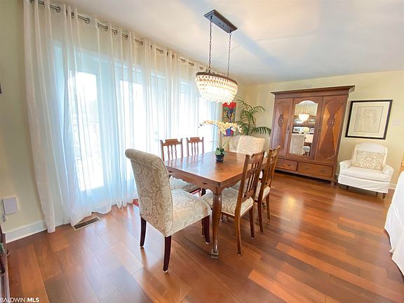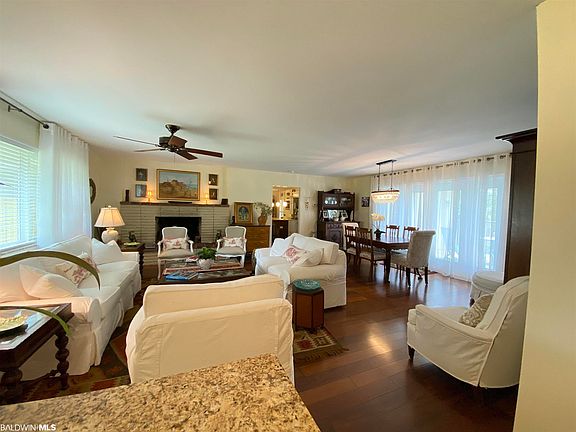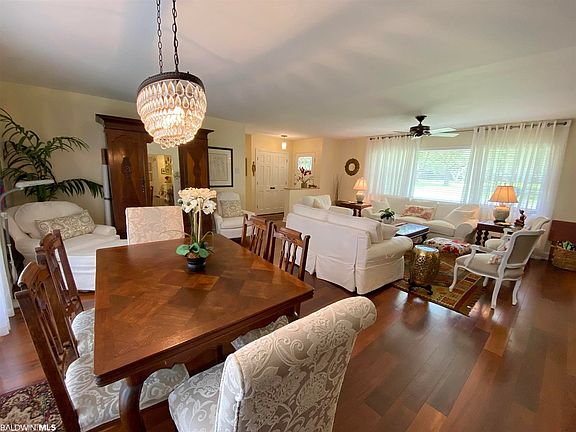 Quaint & rare is what you'll find nestled here in the heart of sought-after Magnolia Springs. This acre +/- corner parcel is adorned by an abundant array of beautifully kept & mature landscaping. The natural lighting throughout spills perfectly into this spacious floor plan. Entering into the front door you'll immediately appreciate the wood laminate flooring, plantation shutters, & ceiling fans throughout this charming & well-kept home. The large great room features an electric insert in the brick wood-burning fireplace. The wall of doors that open up onto the large backyard deck is pleasing from the spacious dining area. The kitchen is upgraded with granite countertops, a tiled backsplash, & a stainless steel appliance package that includes a gas range. There is a large kitchen island as well as above and below cabinet lighting. The bonus room is upgraded with tile flooring & offers access to both decks. The master bedroom features an ensuite bath that boasts wall tiles, a tiled & granite trimmed walk-in shower, upgraded granite vanity with under-mount sinks, & tile flooring. The guest bathroom features a large soaking tub surrounded with wall tile, upgraded granite vanity, & tile flooring. The 18X36 vinyl pool is enclosed by a 25X49 screened lanai, installed in 2016. The 10X14 shed stores the riding mower that can be negotiated to convey. The property is fenced with vinyl-coated chain link & wood privacy. The windows have been upgraded & there are solid wood doors throughout. The gas water heater is new. There is a tremendous amount of floored storage space built in the ceiling area of the garage. Pride in ownership & master gardening is shown throughout every feature & detail of this home & property. All within walking distance to the Magnolia River & Jesse's restaurant which is referred to as one of the south's best-kept secrets. 30 minutes north of the beach. This property consists of two parcel numbers in the county records PPIN 047816 & 307823.