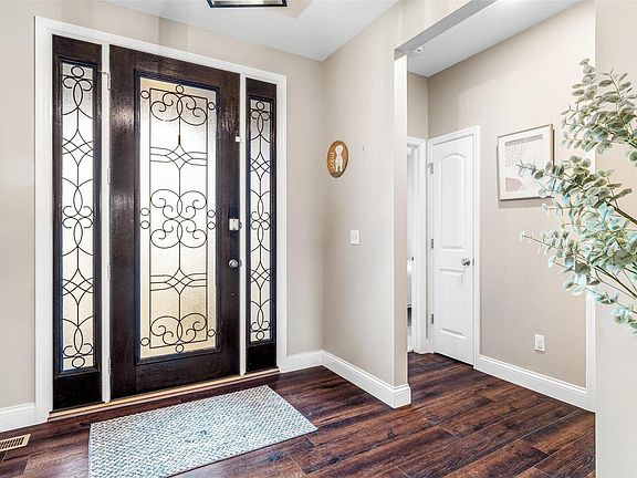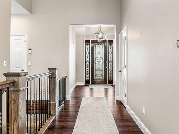 Experience the grand appeal of 11' ceilings along with transom windows that fill this home with light and spaciousness even on cloudy days. This stunning ranch boasts an open floor plan perfect for entertaining, with a luxury  kitchen featuring a quartz center island, custom cabinetry, marble backsplash, wine cooler, and high-end stainless appliances. The dining room overlooks the large private back yard, enclosed by sleek wrought iron fencing and does not back to neighbors. Grab a movie and popcorn, it's your turn to put on the fire and get cozy in this warm inviting great room big enough for a large sectional and all the blankets. The primary suite, with coffered ceilings, includes a luxurious bath with a double vanity, soaking tub, separate shower, and walk-in closet. An open staircase leads to the lower level with finished family area, large bedroom and private bathroom. Wired with smart technology and beautifully maintained, this home is ready to be loved by its next owner.