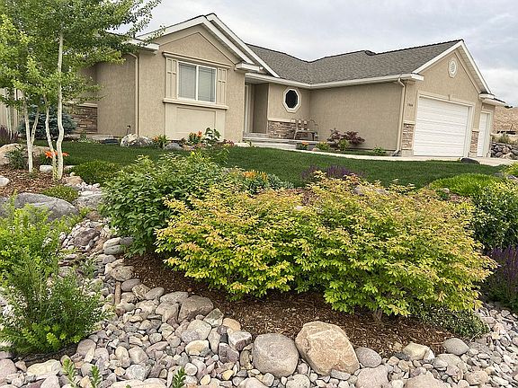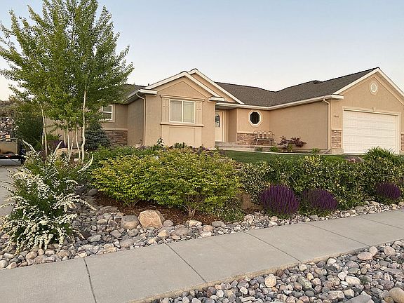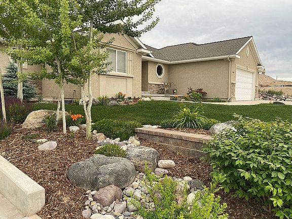 Call/Text for a showing: 801-592-3172. (We are accepting offers through Sept 19th, 2021) Beautiful home with a view! Custom yard, perfect for a young family! Open floor plan, with the living room open to the kitchen and dining room. Living room features crown molding wired for optional lighting, and a gas fireplace. An adjacent piano room/office/bedroom with glass French doors, adds to the open feel of the living space. The kitchen features hickory cabinets, granite countertops, an island, and corner pantry. Two bedrooms (plus an optional 3rd) are on the main floor, and 2 large bedrooms are downstairs, each with walk-in closets. Master bed/bath features a large bay window (with stunning views of backyard landscaping), oversized jetted tub, separate shower, and walk-in closet. The home has 3 full baths with granite countertops. Basement bathroom also has a jetted tub. Basement features a large family room with wet bar and floor-to-ceiling oak bookshelves. Both the family room and bonus/theater room are wired for surround sound. Utility room houses HVAC, water softener, large 75-gallon water heater, and room for storage. Large L-shaped storage room with built-in shelves and space for more shelving. 0.28-acre lot custom landscaped with grass, flower beds, trees, swing-set gravel area, firepit, and large tiered rock wall. Flowing cement path around the backyard provides an awesome ride for littles on bikes/rollerblades. Both front and back yards have beautiful dry stream beds that fill with water when it rains, adding to the amazing landscape. Gorgeous garden area is protected by custom mason walls and iron gates, and features 7 grow boxes and 4 fruit trees! Blackberries, strawberries, and grapes! 3 car attached garage with extra deep bay and large RV pad. Central vacuum system and sprinkler system tailor-made for landscaping/garden. $25k solar power system (6.51 kW) includes 21 panels and provides a bank of electricity that will keep your power bill at $5/month. The large front porch has room for a bench or swing, and the incredible sunset views will never be blocked! Come and see!