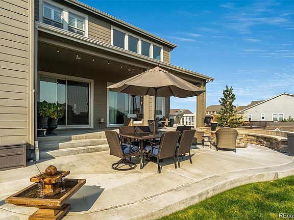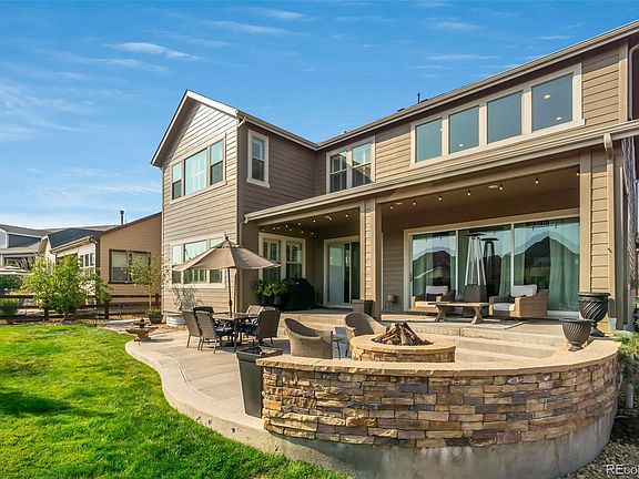 This gorgeous home is perfectly situated on a corner lot and boasts five spacious bedrooms, an office and bonus hearth room. As you enter from the covered front porch you will immediately notice the custom details and designer elements throughout the home. From the amazing and well appointed kitchen, to the popular hearth room (often used as a formal dining room), and fantastic open concept great room with a floor to ceiling custom fireplace surround, triple oversized glass doors leading to a wonderful covered back patio, and plantation shutters throughout the entire home. The gorgeous privacy fenced yard has been professionally landscaped and has a wonderful firepit too. All of the work has been done and this home is ready to be ENJOYED! The upper level boasts a private master retreat, three additional spacious bedrooms, a bonus exercise/homework nook, and a dream laundry room. The professionally finished basement has plenty of space for every one, and a guest bed and bath. This home has great Denver, Colorado Springs and DIA access, which offer fine dining and great shopping options. There are also numerous trails and parks within walking distance, and the new recreation incline will also be just a short walk.
