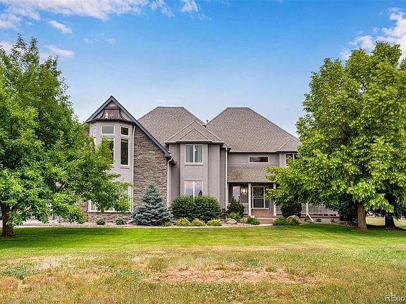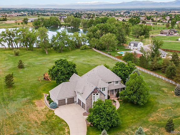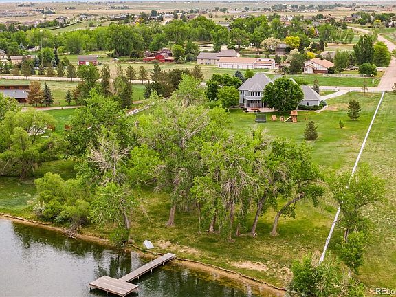 LAKEFRONT Beauty! Exceptional craftsmanship, elevated distinction! A once in a lifetime opportunity! Situated on 3.7 Acres (m/l) with LAKEFRONT! One of the finest Estates in Wadley Farms 3!! Custom 2-Story home with Distinguished Staircase/Soaring windows on a Private LAKE Lot! Paddle Board/Fish Of Your Rowboat! Gaze At the Stars! So Much to Discover!! The kitchen boasts Quality cabinets Center Island & huge Walk-in Pantry! The windows in the kitchen capture the Beauty of the Location. Coffered Ceiling in the Stunning Formal Dining Room! Views & Privacy of the Meadow like 3.7+Acres. The Distinction of an Extraordinarily high ceiling in the family room with a fireplace & Wet Bar set the stage for the Elegance this estate presents. A main floor study/or guest suite, a Big laundry including cabinets & a Storage room with an abundance of custom-built Shelves all adds to the amazing features of this beautiful estate. The east side staircase of the house offers a Very Private Entrance & Suite. The Master Suite extends a balcony with a Panoramic view of the Lake & the mountains to the west! Plus, a gas fireplace & sitting area in the Master Suite offering a perfect Balance of Tranquility. Upstairs offer an additional 3 Bedrooms with ample living area & 2 Full Baths Custom Closets. The Grand Living Space in the Finished Basement has a Full Bath with a custom Steam Shower, Dance Floor and Theater enclave. The Distinctly Designed Back Patio & Hot Tub set the stage for Pristine Colorado Days & Evenings with an elevated Lifestyle in Rural Surroundings. Meander to the Dock to relax & unwind, maybe- fish or enjoy Rowing the boat around the LAKE! Horses Allowed. The Oversized 4 Car Garages have built in Storage & Shelving. Feel a world away from all the pandemonium, while being an easy & QUICK commute to DIA, Shopping/Denver Premium Outlets & the Orchard, Dining, Denver & Boulder, in addition to Adams 12 Five Star Schools, as well as Charter schools & Academy’s