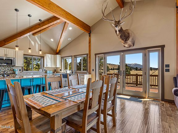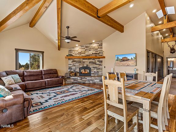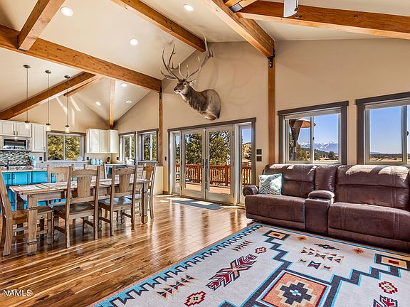 Imagine yourself in this stunning home and barn. An amazing one-of-a-kind design perfect for the horse enthusiast and any decerning Buyer who is looking for expansive indoor/outdoor spaces as well as stunning views, views, and more views! This exquisite home is an open frame & beam structure with vaulted ceilings throughout. Acacia wood flooring in living areas, lovely natural light and a high efficiency fireplace for those chilly nights. And AC for those warmer days! The Kitchen has gorgeous Medallion cabinetry, copper hammered sinks, walk in pantry, and high-end appliances. The Primary bedroom has access to the deck, an ensuite bath with a huge, fabulous shower. Two additional bedrooms upstairs and a potential (heated) 4th bedroom on the 1st floor cont.. The barn is incredible with 2 stalls, , washbay & tack room. All on 6.93 acres backing FS land and amazing views of the San Francisco Peaks. Located in Parks, a charming community only 25 mins to Flagstaff. Enjoy all the outdoor activities that this area has to offer!
