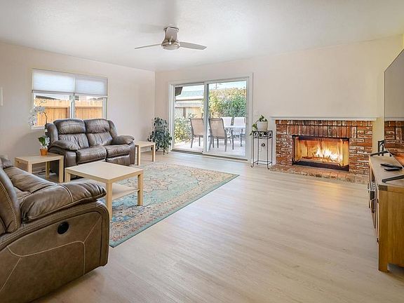 Single-level Craftsman home tucked away on a quiet cul-de-sac, offering 4 bedrooms, 2 full baths, and 1,510 SF of open-concept living. The bright and inviting living room features a wood-burning fireplace with mantel and direct access through a large slider to a redwood deck perfect for family gatherings or dining al fresco. The fully remodeled kitchen is designed for both function and connection, featuring stunning Hickory Cabinetry, farmhouse sink, pantry cabinet, casual counter seating for on-the-go meals, gas cooktop with pot filler, recessed lighting, and two Lazy Susans for maximum efficiency. The kitchen is spacious enough for a large family eat-in dining area, making it the true heart of the home. The primary suite offers abundant natural light, large slider to private backyard, dual closets, en-nsuite bath with dual shower heads, including a rain head, and a river rock shower floor for a relaxing, massage-like experience. A bonus finished room in the garage—fully vented and insulated—provides flexible space ideal for a home office, workshop, or gym. Additional highlights include raised garden beds (with a variety of vegetables planted), a chicken coop (fresh eggs), new fencing, low-maintenance landscaping, and a private backyard with mature fruit trees including Fuji apple and Meyer lemon. There is Secret Garden with arbor entry its just the perfect touch to this incredible versatile property. If you love the sounds of happy birds this is the home for you, there is stunning flowering hedge that surrounds the front portion of the home for full privacy and it creates a lovely environment. Major systems have been updated with a roof approximately 4 years old and Furnace roughly 6–7 years old. This move-in-ready home blends comfort, charm, and functionality in a peaceful setting.
