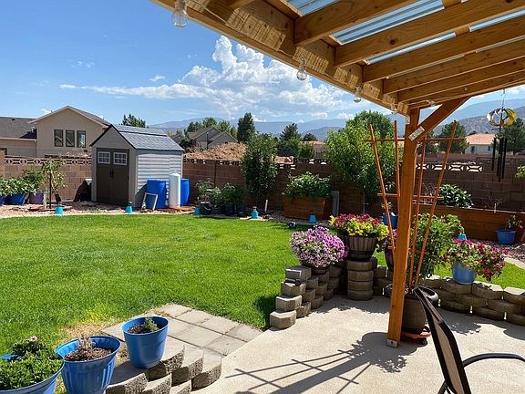 Great home in a great location with mountain views. This home has updated flooring, new pergola over the patio, a gorgeous backyard and a newer shed. There are 3 raised flower beds, a garden, a patio & 6 fruit trees, (2 peach, 2 plum, 1 apple & 1 apricot.) 3beds/2 full baths on one level and attached 2-car garage. A must see! Refrigerator included.