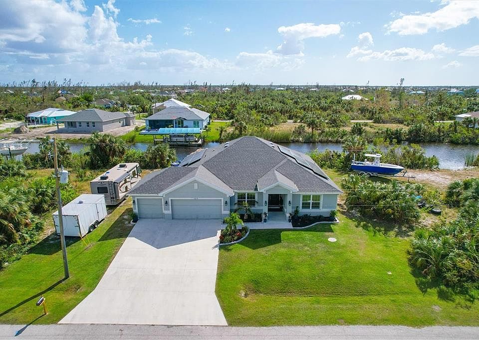 If you are ready for sun, fun and the relaxed tropical lifestyle this exceptional gulf access home with an extraordinary view awaits you. Located in the highly desirable waterfront community of South Gulf Cove, just minutes from shopping, waterfront dining, world class fishing in Boca Grande and endless opportunities for shelling local beaches. This home has it all! There is plenty of room for family and friends with over 2400 square feet of living space all on one floor. The bright, flowing, open floorplan is remarkable for living and entertaining. This home features an AMAZING MASTER SUITE WITH HIS AND HER BATHROOMS AND WALK IN CLOSETS, as well as a picturesque siting area overlooking the beautiful waterfront view. In addition, there is a living room, family room, dining room, an oversized laundry room and flex space! This flex space which also has a large closet, is located away from the main living room which makes for a perfect home office, yoga studio or fourth bedroom. Other features of this home include planation shutters, a coastal color palette, upgraded kitchen with custom backsplash, wood cabinets, granite counter tops, and a massive triple sliding glass door overlooking the most amazing view! Outside you will be swoon as you enjoy your cup of coffee in the morning or a dive in the pool while overlooking your own piece of paradise. The owners have also added a floating dock for kayaks, custom pergola and lush landscaping to make your backyard the perfect tropical oasis! If that is not enough, the MASSIVE THREE CAR GARAGE and WHOLE HOME SOLAR PANELS certainly make this your Florida DREAM HOME! Why wait to build when this nearly new DREAM HOME is available NOW?