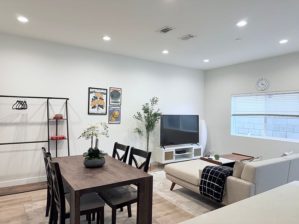 Welcome to our newly built, modern 3-bedroom, 2.5-bathroom Airbnb in the heart of Midway City! This high-end retreat features thoughtfully curated furnishings and can comfortably accommodate up to 11 guests. The spacious primary bedroom boasts a plush king-sized bed, a walk-in closet, and an en-suite bathroom with a luxurious rainfall shower. Two additional bedrooms offer queen-sized beds and ample storage, while the open-concept living space invites relaxation with cozy seating and a large smart TV. The fully equipped kitchen showcases sleek quartz countertops, stainless steel appliances, and a dining table perfect for shared meals. Step outside to a private patio where you can unwind after a day of exploring. Guests will appreciate the convenience of in-unit laundry and a dedicated workspace. The location is unbeatable! Just minutes from Disneyland, the beaches, Little Saigon, South Coast Plaza, and Rodeo 39, this home is ideal for family vacations or group getaways. Whether you're here for adventure or relaxation, this Airbnb provides the perfect balance of comfort and accessibility. Please observe our house rules. We have these rules in place to maintain the highest quality stay for our guests! Unplug all unused appliances, hair curler, laptop chargers from socket when leaving the home. Turn off the stove, oven, and AC/heater. No Smoking or drugs of ANY KIND. Sensors are installed throughout the house to detect smokes. No Extra/ Overnight Guests (we reserve the right to cancel your reservation) No Mail Delivered here Please refrain from unplugging of the electronics No Pets Please be mindful of our neighbors. We have a shared wall and we do our best to not disturb them. No loud noise or music past 9:30pm 10am is check out time. **We reserve the right to cancel your reservation and keep your security deposit if these rules are broken The managers are not responsible for any accidents, injuries or illness that occurs while on the premises or its facilities. The managers are not responsible for the loss of personal belongings or valuables of the guest. By accepting this reservation, it is agreed that all guests are expressly assuming the risk of any harm arising from their use of the premises or others whom they invite to use the premise. Security surveillance cameras are installed at the outside parameter of the property. There are 2 cameras located around the property. 1 at the front door facing away from the property & 1 located above the garage entry door facing outward away from the house. Both of them are recording when motion is detected. Your privacy is protected. Noise monitoring device is installed in the living room to monitor the decibel level, only to alert the property managers when decibel is higher than normal. No commercial activities and/or vehicles are allowed in this property. Violation of the no-smoking policy will result in a $1,000 fine which will go towards repairing any smoke damages to the property. Thank you