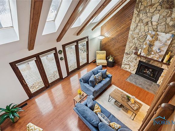 FRESH UPDATES MADE WITH NEW PAINT AND FLOORING! Large riverfront lot on the Auglaize. Each of the three large bedrooms are accentuated with a private balcony or deck. The maturely landscaped yard & full-length deck overlook private boat docking. Well-appointed architectural details throughout including soaring ceilings with natural wood beam accents that invite your eye to explore each space. The floor to ceiling stone fireplace is easily enjoyed from each room through the open concept design. Many convenient highlights: Main floor master suite & laundry, home office and a private boat launch!